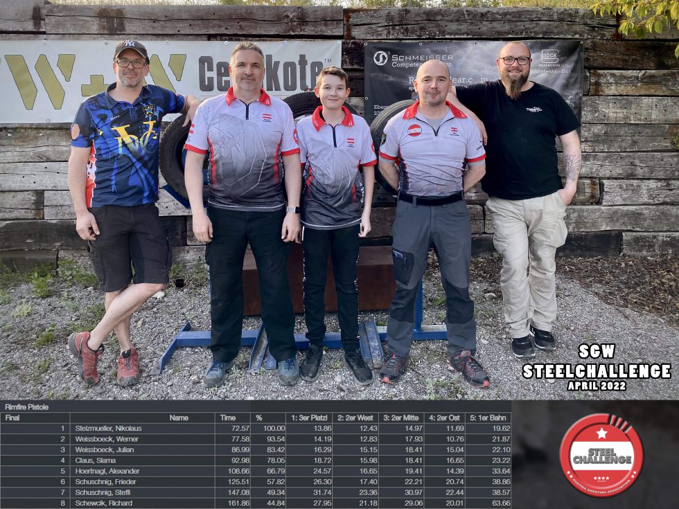 Den am 30. April 2022 fand die fünfte SGW Steelchallenge bei unseren Feunden in Leobersdorf statt. In der Kategorie Rimfire Pistol, gingen alle drei Stockerlplätze an die Sportschützen der ASKÖ Sportschützen Vöcklabruck. Besonders hervorzuheben ist hier die Leistung von Julian Weißböck. Dieser musste in der Allgemeinen Klasse mit den Männern starten, da es keine eigene Jugendwertung bei der Pistole gab und konnten sich die Bronzemedaille sichern und hat die restlichen Wettkampfschützen ordentlich abgehängt. Somit gab es jede Menge Gold und Silber für Niki Stelzmüller, Julian Weißböck und Werner Weißböck.